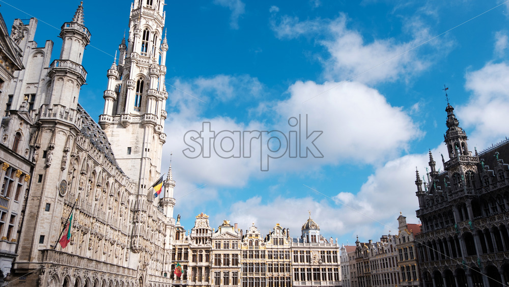 BRUSSELS, BELGIUM – MAY 9, 2018: City buildings facade at Grand Place in a sunny day. Bright clear sky on background. Negative copy space, place for text. Brussels, Belgium Royalty Free Stock photo