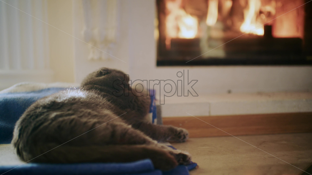 Gray cat resting on a soft blanket near a lit fireplace in a cozy living room