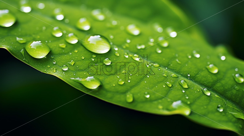 Water drops close up on a green leaf