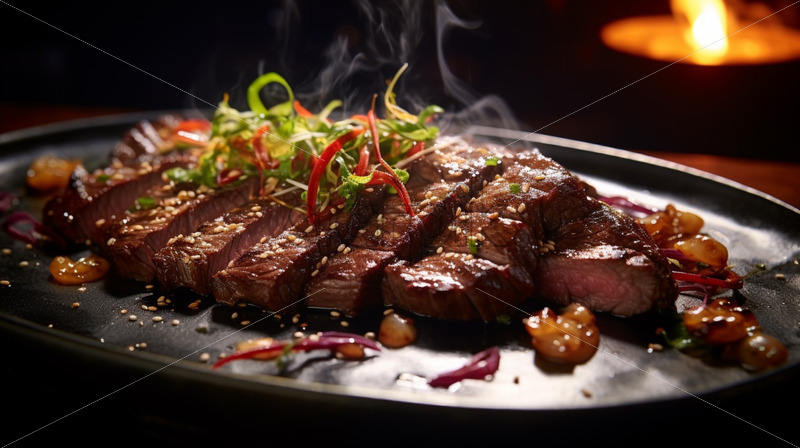 Close up of a Sirloin Steak with Barbecue Sauce and micro-plants on the side Royalty Free Stock Video Footage