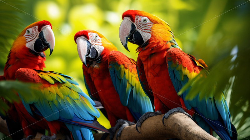 Group of colorful macaws engaged in vibrant midday chatter amid lush foliage