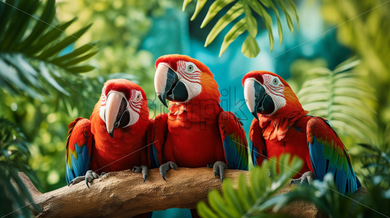 Group of colorful macaws engaged in vibrant midday chatter amid lush foliage