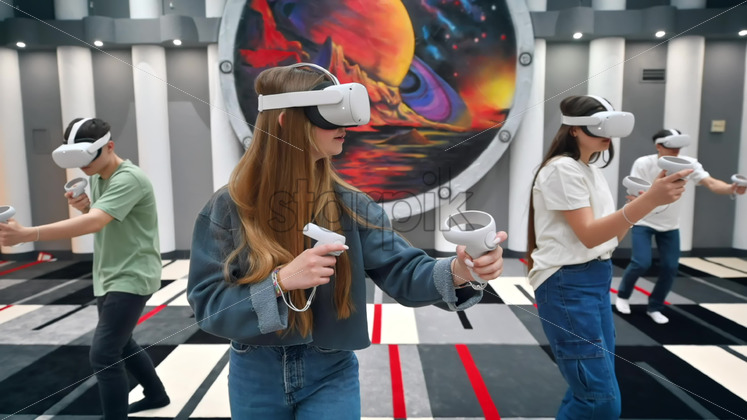 Group of four teens with VR headset and controllers playing games in a team. Tactfully walking through the VR arena. Slow motion Royalty Free Stock Video Footage