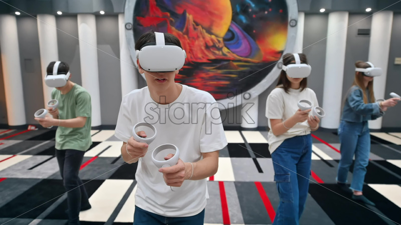 Group of four teens with VR headset and controllers playing games in a team. Tactfully walking through the VR arena. Slow motion Royalty Free Stock Video Footage