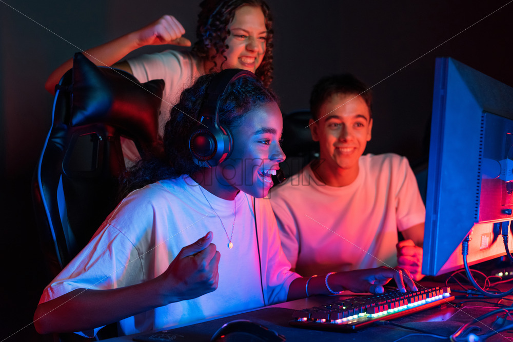 Group of multiracial teens playing video games in video game club with blue and red illumination. Excited because of a victory