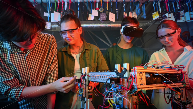 Group of teens doing experiments in robotics in a laboratory. Boys and girls in protective and VR glasses working with a robot. Red and blue illumination, virtual reality Royalty Free Stock Video Footage