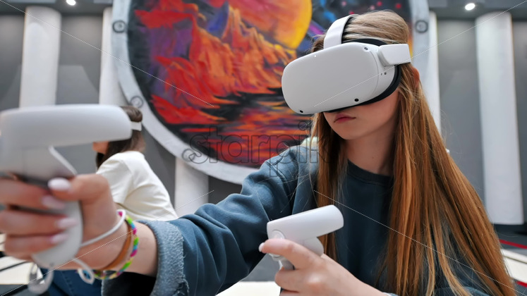 Premium stock video footage – Group of joyful, interested young people playing on VR treadmill with helmets and controllers. Slow motion virtual reality Download royalty free stock video footage