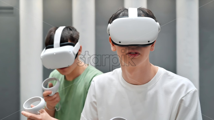 Group of two teens with VR headset and controllers playing games in a team. Tactfully walking through the VR arena. Slow motion Royalty Free Stock Video Footage