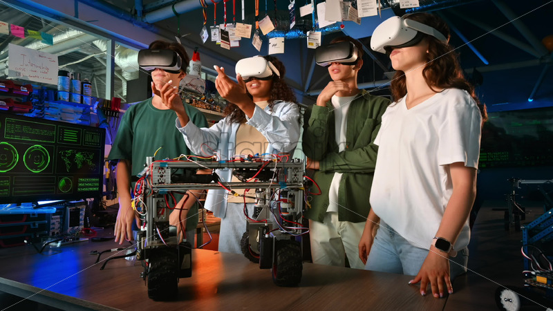 Group of young people discussing and putting on VR glasses while doing experiments in robotics in a laboratory. Robot on the table, virtual reality Royalty Free Stock Video Footage