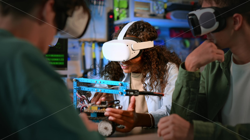 Group of young people in VR glasses doing experiments in robotics in a laboratory. Robot on the table, virtual reality Royalty Free Stock Video Footage