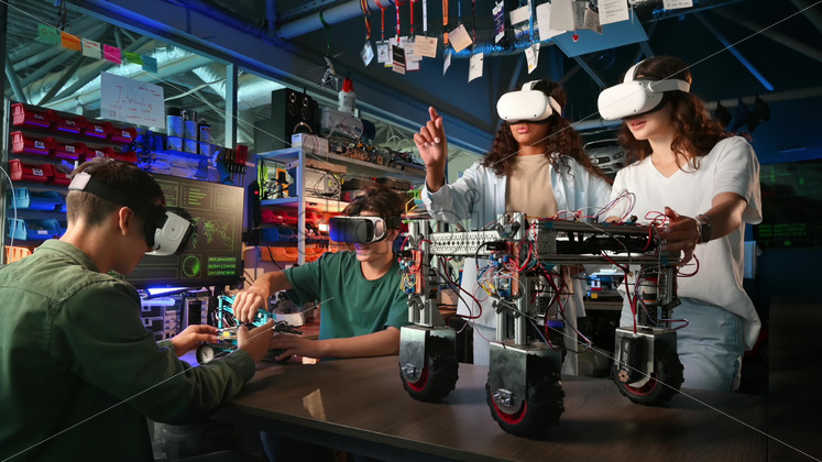 Group of young people in VR glasses doing experiments in robotics in a laboratory. Robots on the table, virtual reality Royalty Free Stock Video Footage
