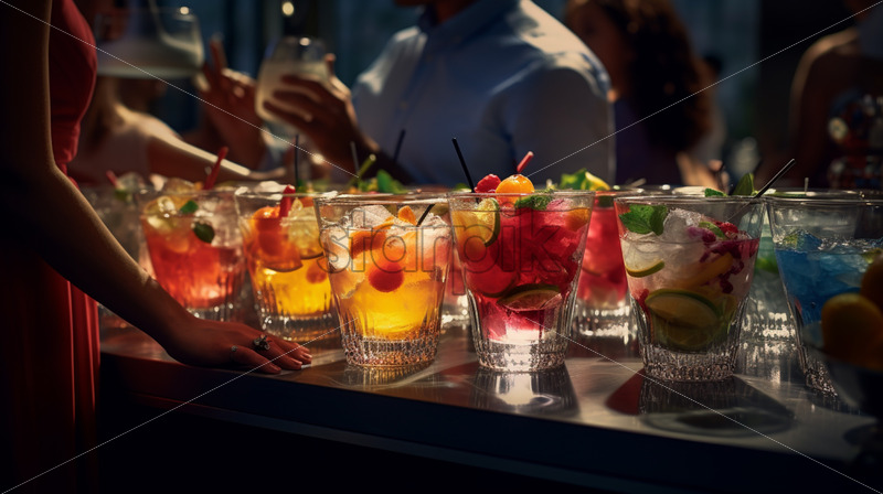 Guests of party enjoying refreshing drinks at a well-stocked beverage station