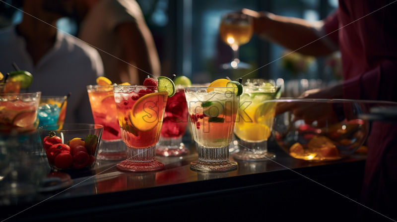 Guests of party enjoying refreshing drinks at a well-stocked beverage station