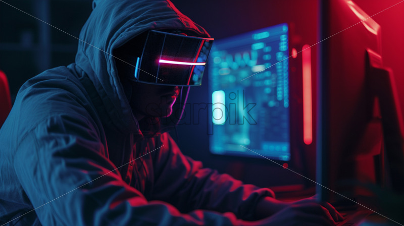 A young interested woman playing in VR games using VR glasses and controllers, red and blue illumination. Slow motion virtual reality Download royalty free stock video footage. Royalty Free Stock Video Footage