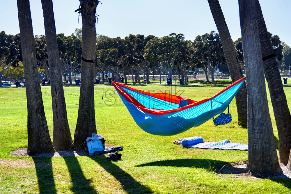 Hammock and sleeping pad in a local park. Person relaxing. San Diego, California