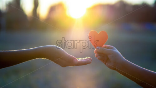 Two male hands holding a donut and an orange. Healthy food idea. Kitchen on the background
