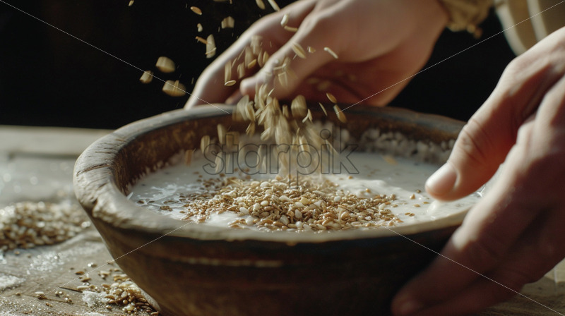 Hands sprinkling seeds on yogurt bowl