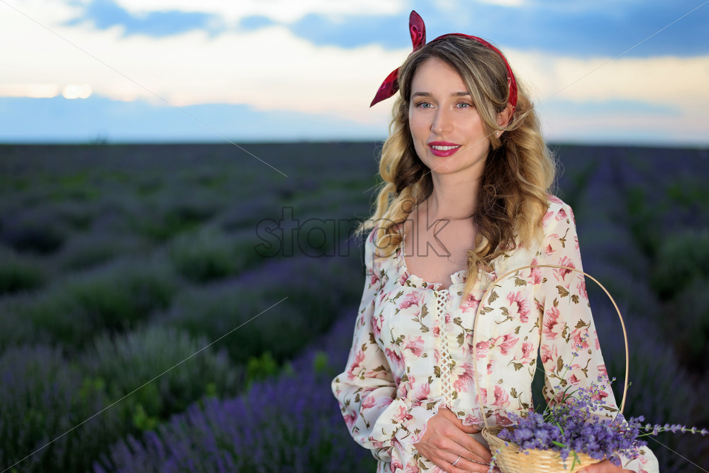 Home » Shop » photo » Happy blonde woman in lavender field at sunset in Moldova, summer flowers dress