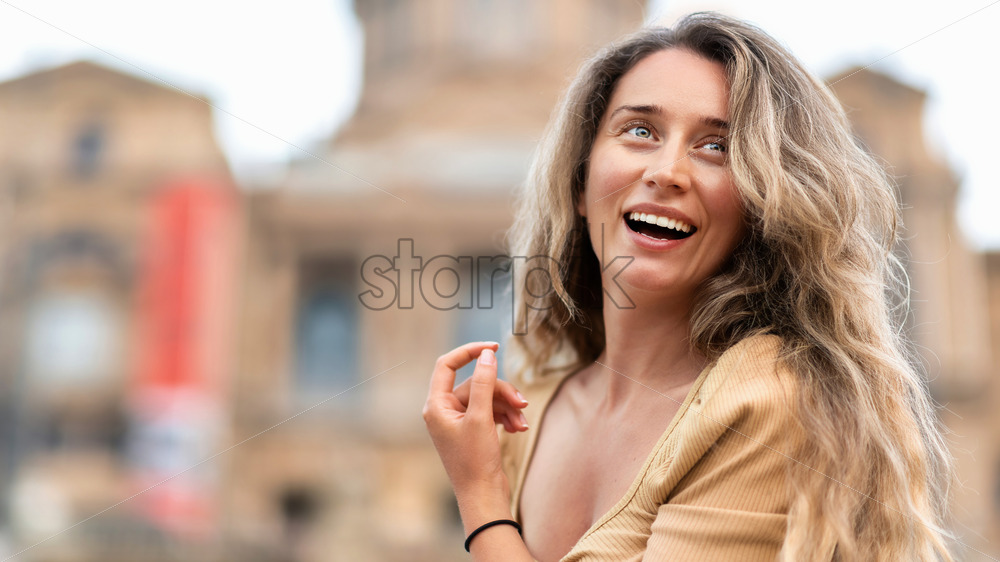 Happy caucasian woman in dress with view of Barcelona on the background, Spain