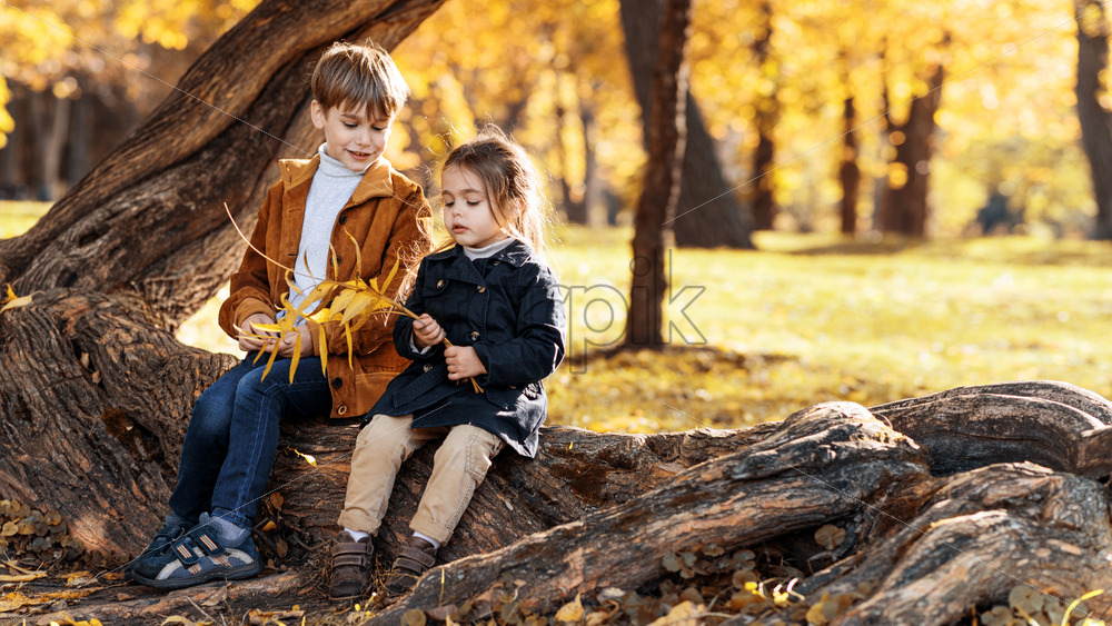 Happy family in an autumn park. Brother and sister sitting on a tree trunk, playing with a twig, yellowed trees around. Slow motion
