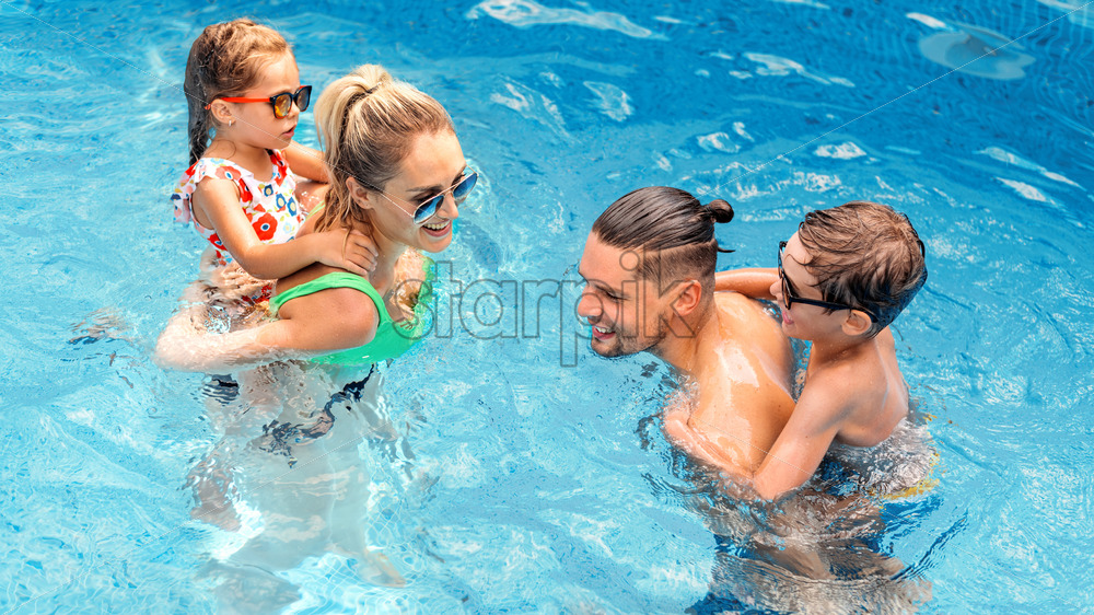 Happy parents kissing their smiling daughter while swimming in the pool. Slow motion Royalty Free Stock Video Footage