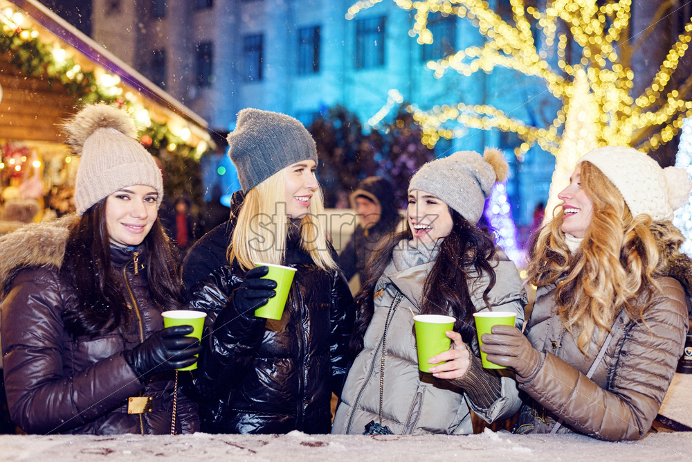 Happy smiling women friends celebrating and drinking wine at christmas market at night Royalty Free Stock photo