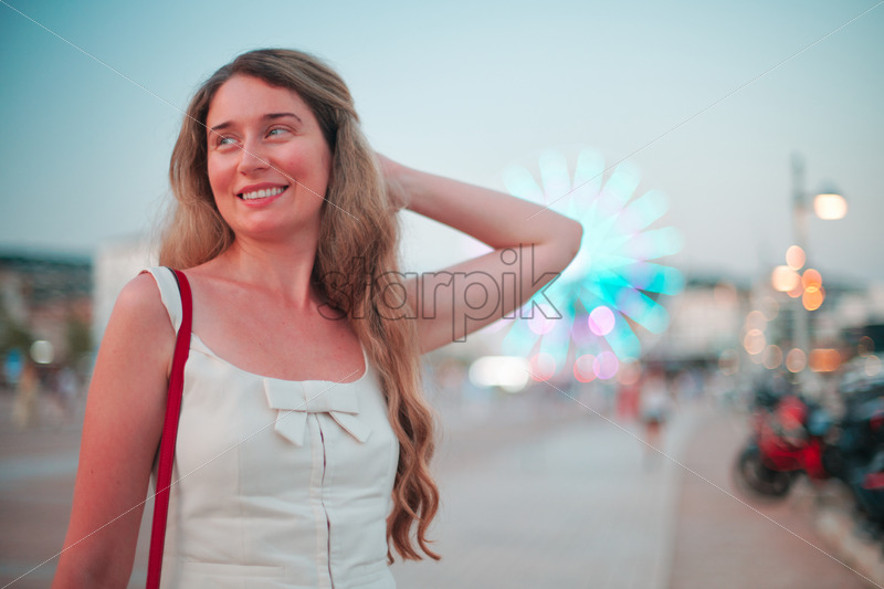 Happy woman in white summer dress posing in front of Cannes rotating wheel, France