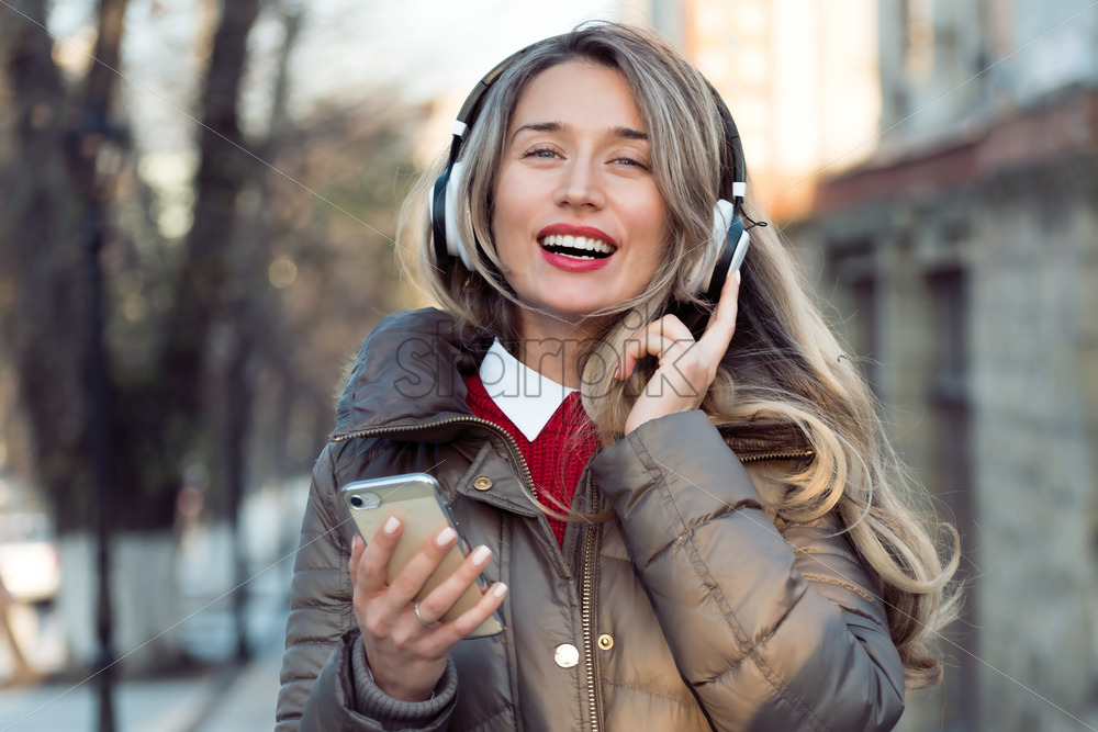 Home » Shop » photo » Happy woman listening to music on wireless headphones connected to mobile phone, on the streets at sunset
