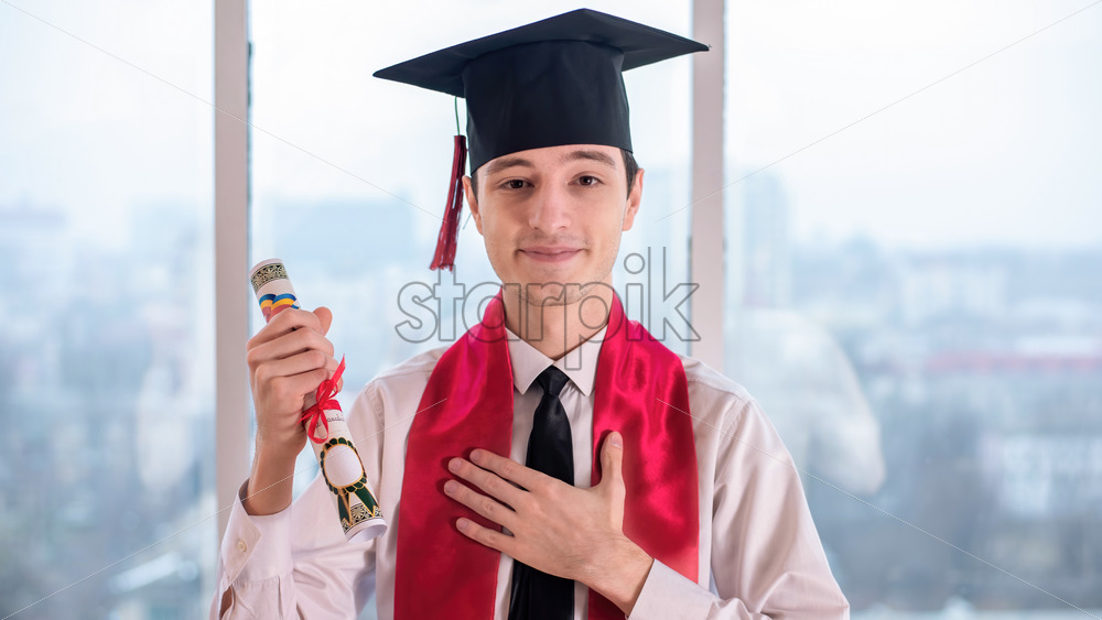 Happy young man at online university graduation at home with a scroll in hands. Academic clothing. Panoramic windows. Social distance idea