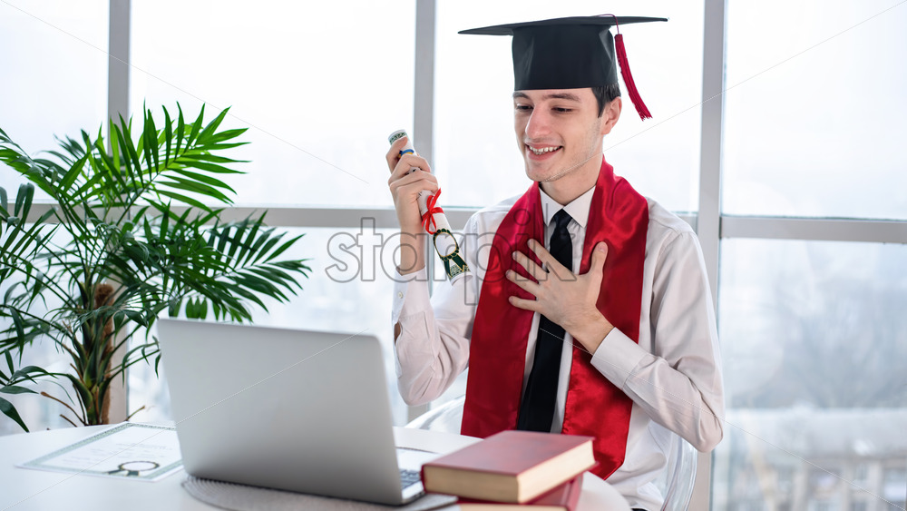 Happy young man talking and gesting at online university graduation in his laptop with a scroll in hands. Academic clothing. Panoramic windows and greenery. Social distance idea