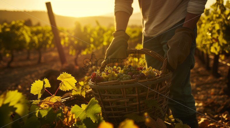 A hardworking farmworker in the sunlit vineyards of Napa Valley, California, with a basket filled with freshly picked grapes.