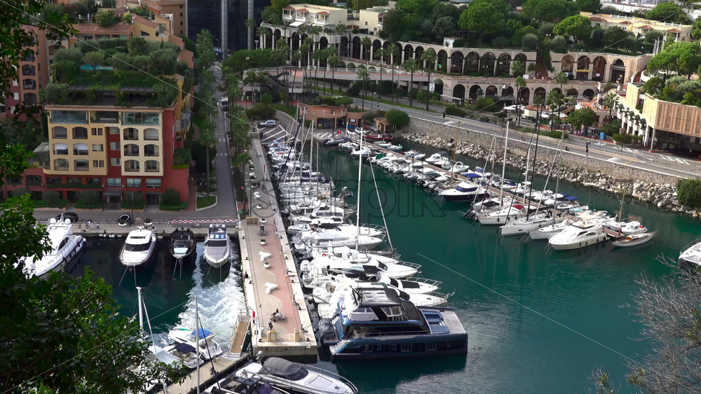 High-angle view of Port de Fontvieille in Monaco, showcasing colorful buildings, luxury yachts, and the surrounding mountainous landscape Royalty Free Stock Video Footage