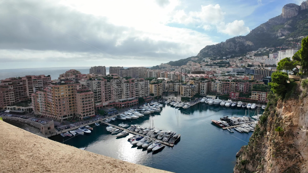 High-angle view of Port de Fontvieille in Monaco, showcasing colorful buildings, luxury yachts, and the surrounding mountainous landscape Royalty Free Stock Video Footage