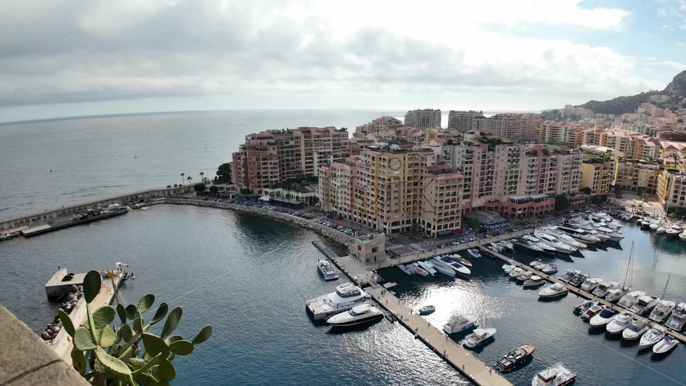 High-angle view of Port de Fontvieille in Monaco, showcasing colorful buildings, luxury yachts, and the surrounding mountainous landscape Royalty Free Stock Video Footage