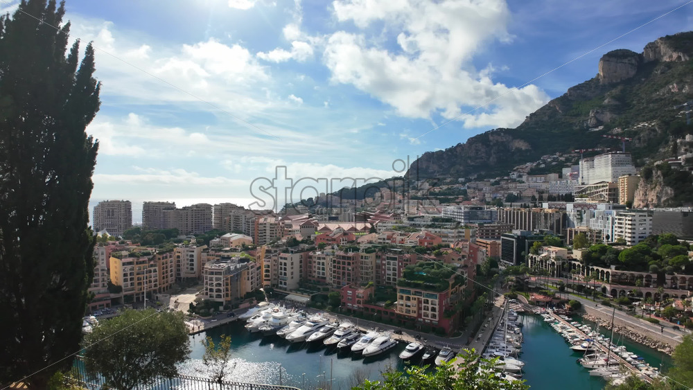 High-angle view of Port de Fontvieille in Monaco, showcasing colorful buildings, luxury yachts, and the surrounding mountainous landscape Royalty Free Stock Video Footage