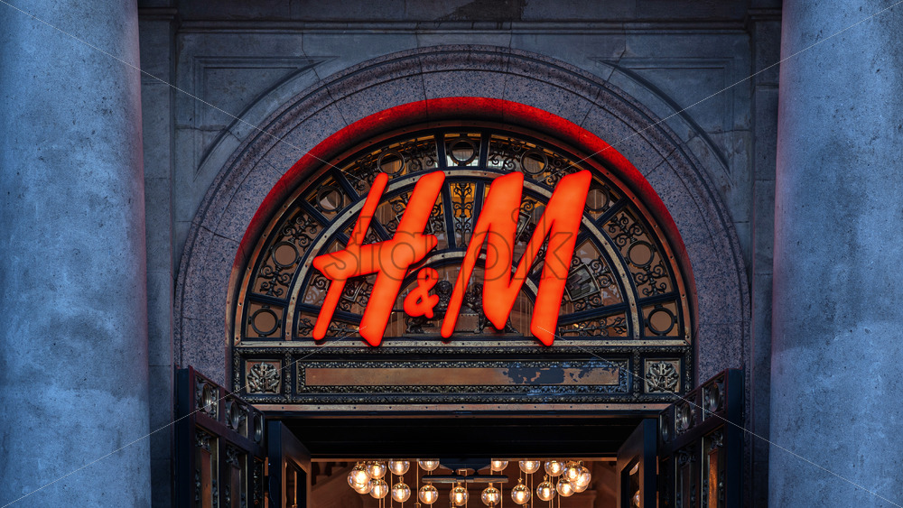 BARCELONA, SPAIN – JUNE 15, 2021: H&M store located in an old building, illumination