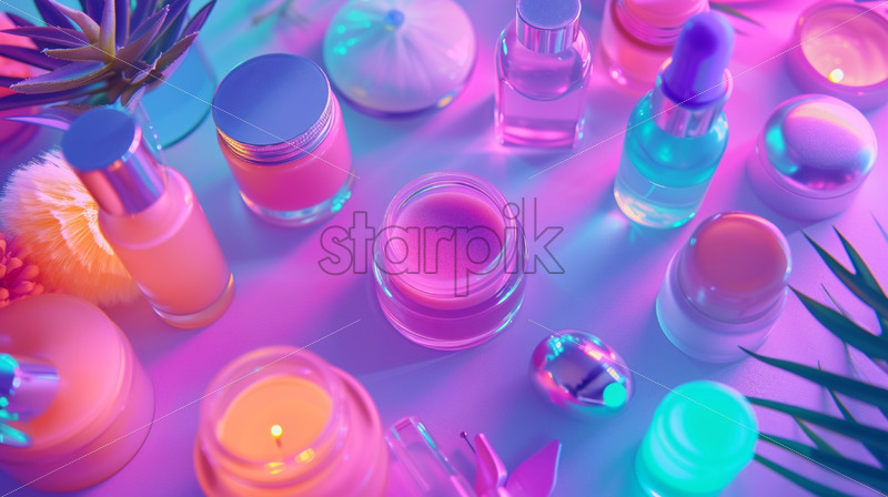 Homemade skincare table, vibrant neon theme, top view