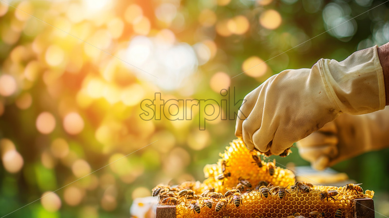 A beekeeper tends to beehives in a sunlit apiary amidst buzzing bees and nature’s gentle hum.