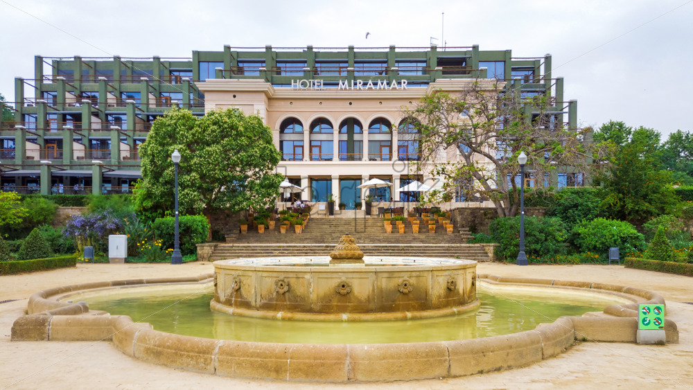 BARCELONA, SPAIN – JUNE 19, 2021: Hotel Miramar. Garden with greenery and fountain in front of it