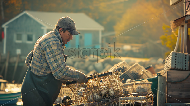 A humble fisherman in a small coastal village in Maine, USA, working with traditional lobster traps in the soft, diffused light of early morning.