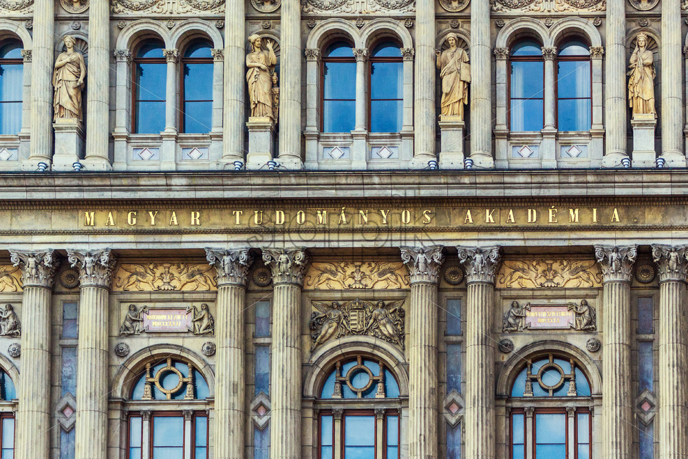 Hungarian Academy of Sciences with close-up at the name. Sunset light reflecting on windows. Royalty Free Stock photo