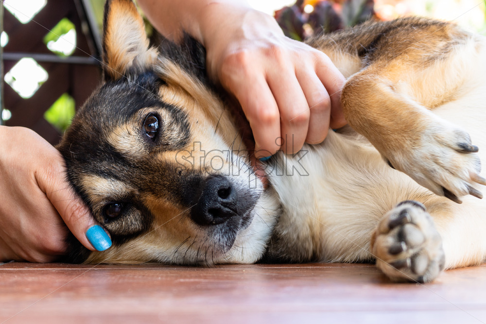 Husky dog tries to have a rest on the ground. Sleepy dog. A girl puts her hand in it’s fur