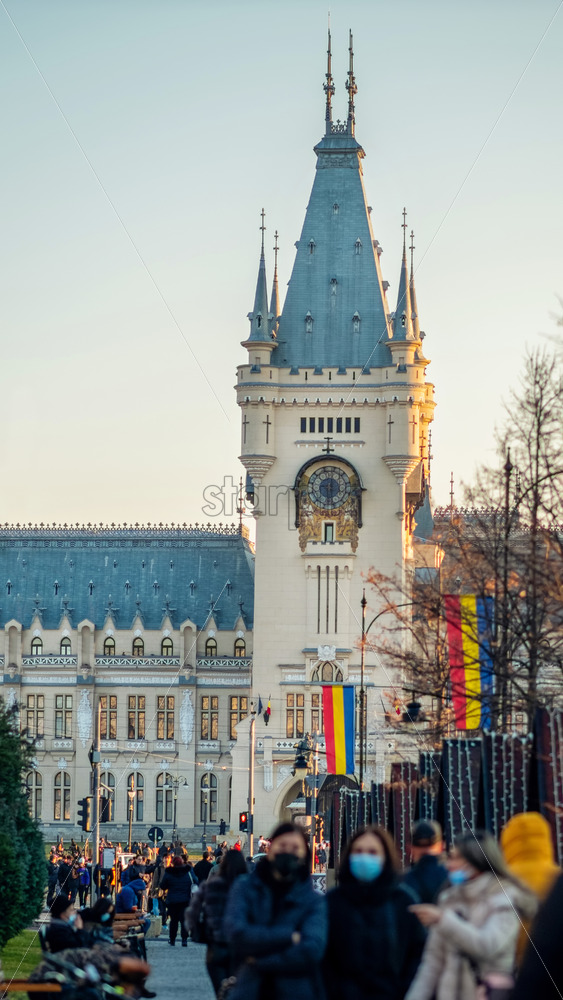 IASI, ROMANIA – DECEMBER, 2021: Streetscape of the city downtown. Multiple walking people, street with Christmas decorations, Palace of Culture in the distance