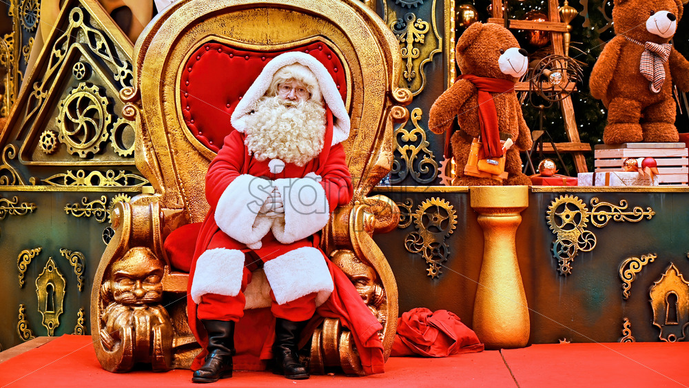 IASI, ROMANIA – DECEMBER 24, 2019: Santa Claus sitting on a golden throne in a mall