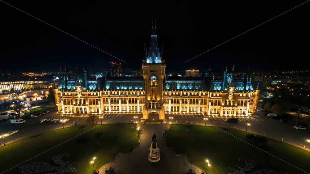 IASI, ROMANIA – NOVEMBER 6, 2021: Aerial drone panoramic view of the Palace of Culture in downtown at night. A lot of illumination, square in front of it