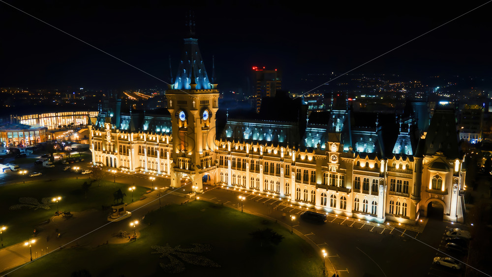 Home » Shop » photo » IASI, ROMANIA – NOVEMBER 6, 2021: Aerial drone panoramic view of the Palace of Culture in downtown at night. A lot of illumination, square in front of it