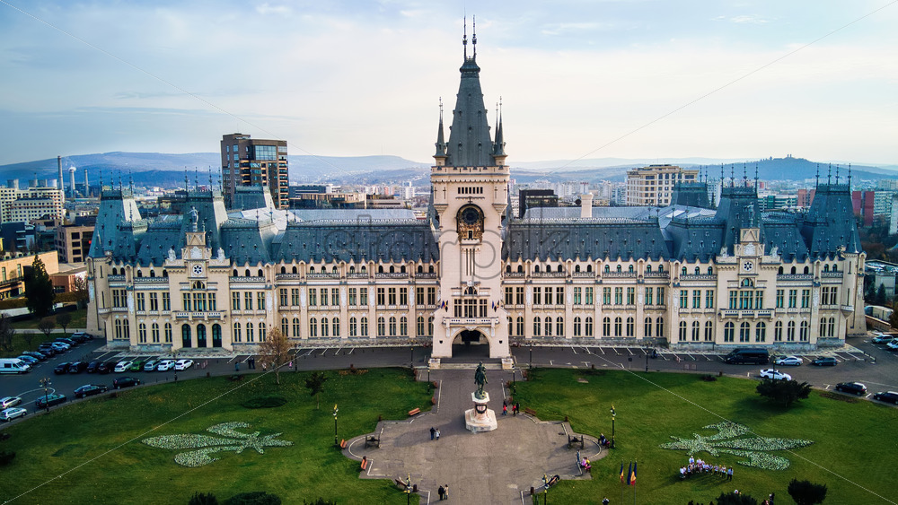 IASI, ROMANIA – NOVEMBER 6, 2021: Aerial drone view of the Palace of Culture in downtown. Square in front of it