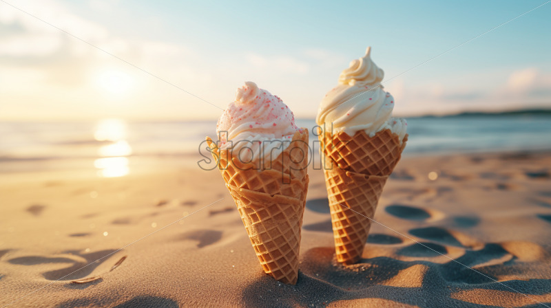 Woman hand holding ice cream with waffle. Lake Como and mountains on background at sunset. Lenno, Italy Royalty Free Stock photo