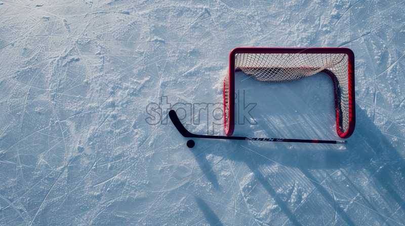 Home » Shop » Uncategorised » Ice hockey stick with black blade, rubber puck, goal net with red frame on smooth ice rink