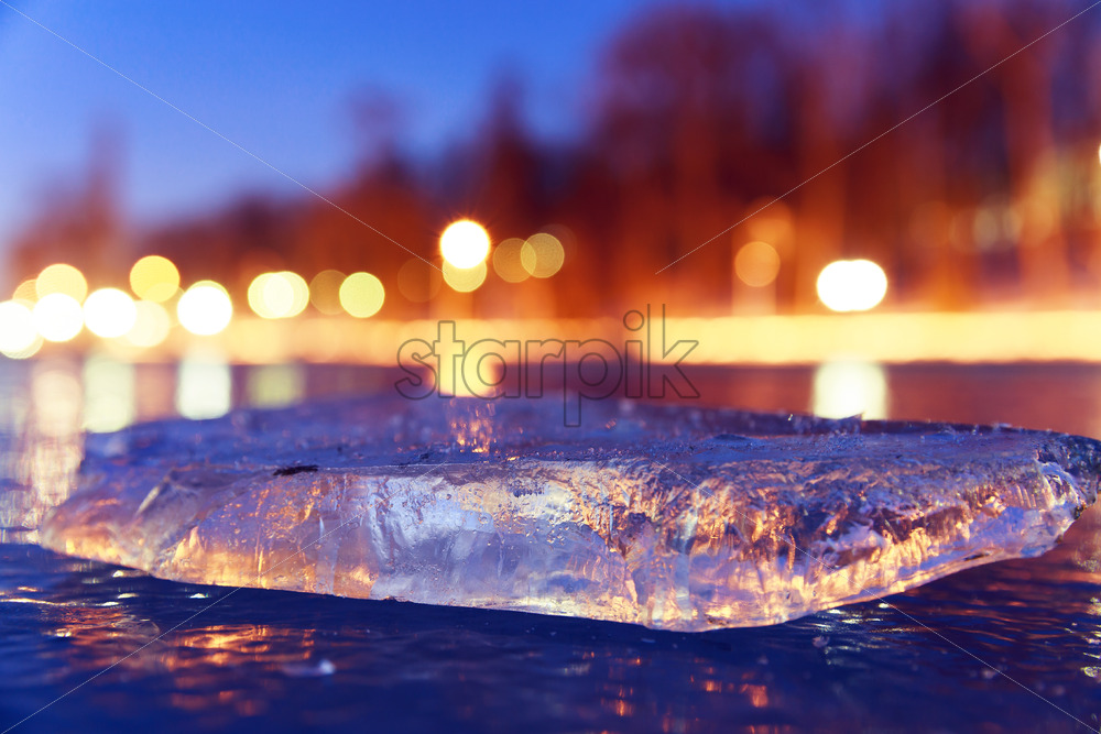 Ice with lights and reflections in the evening, winter at valea morilor park, Chisinau